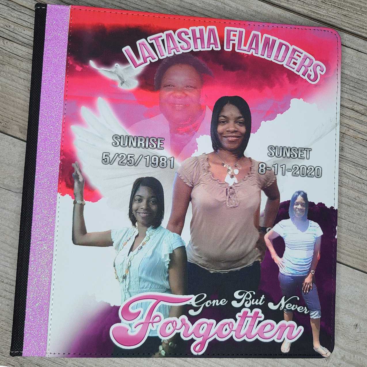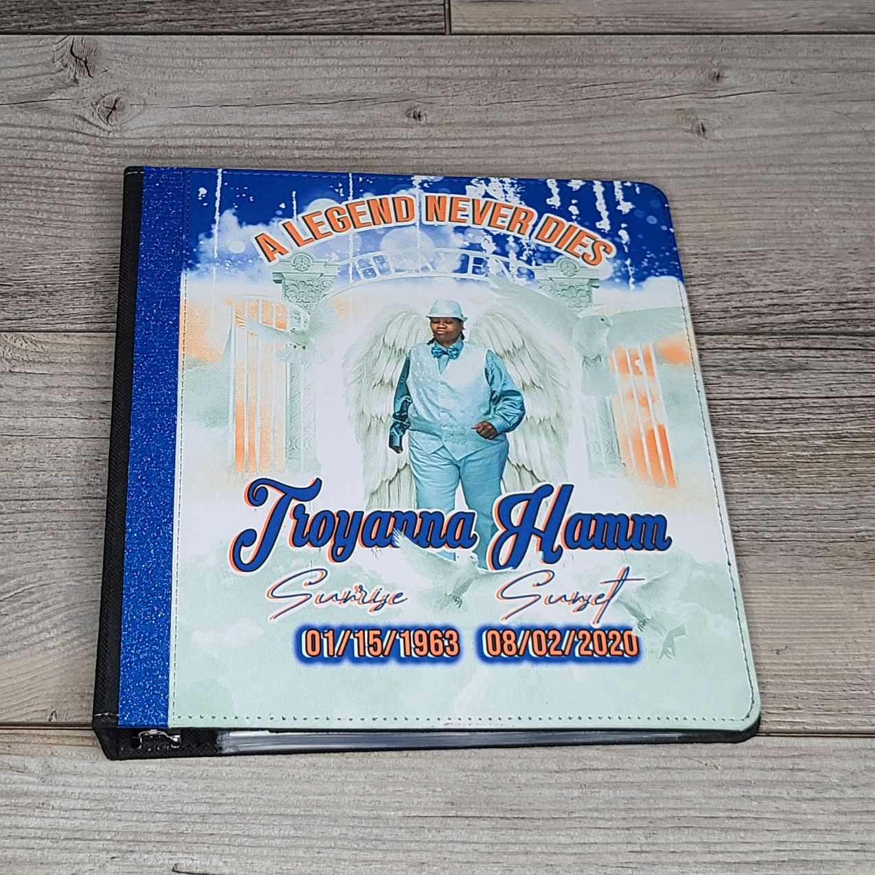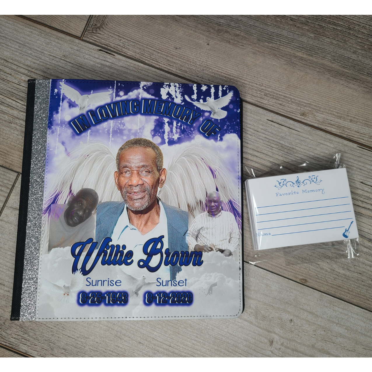 Our beautifully designed 8" x 10" 3-ring binder guest book offers a unique way to commemorate your loved one. Featuring a photo of your loved one on the front and a personalized design, this guest book becomes a cherished keepsake for years to come.